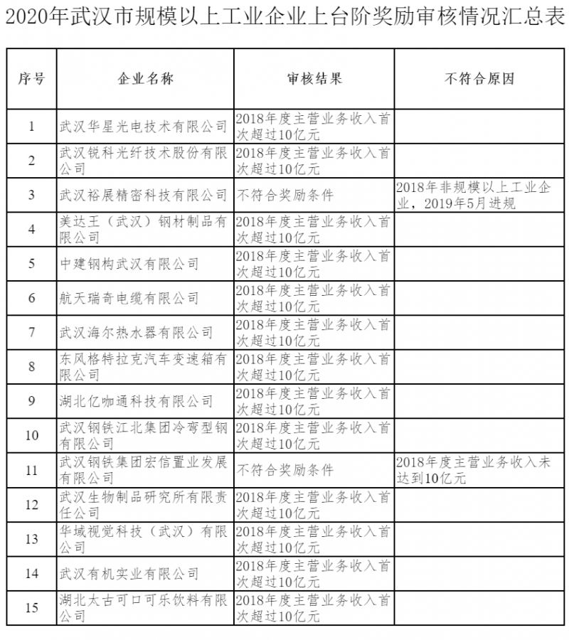 附表:《2020年武漢市規(guī)模以上工業(yè)企業(yè)上臺階獎勵審核情況匯總表》