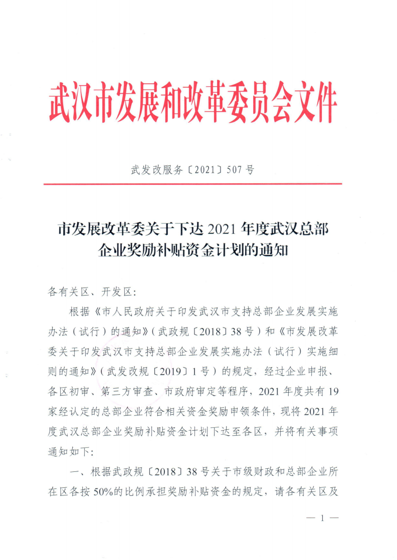 市發(fā)展改革委關(guān)于下達2021年度武漢總部企業(yè)獎勵補貼資金計劃的通知